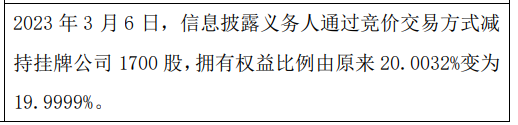 挖贝网3月7日,星业科技(430429)发公告称,2023年3月6日,信息披露义务人袁金钰通过竞价交易方式减持挂牌公司1700股,拥有权益比例由原来20.0032%变为19.9999%。